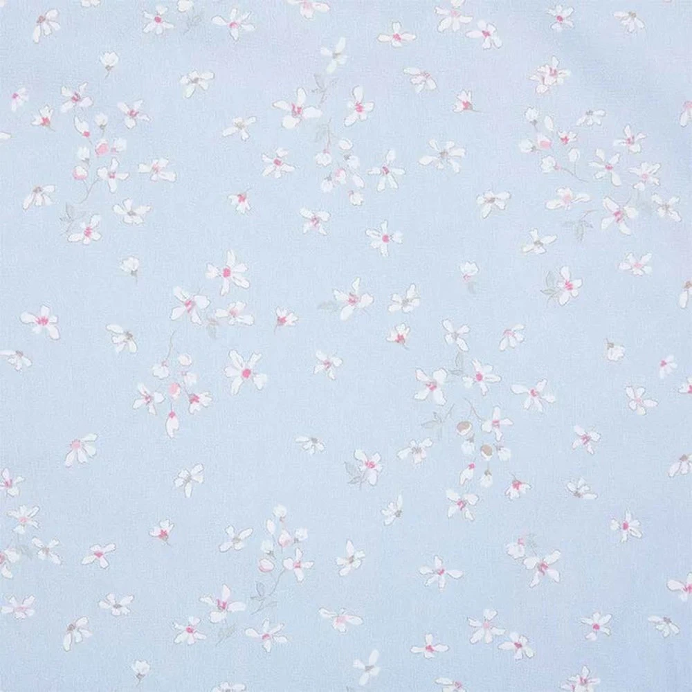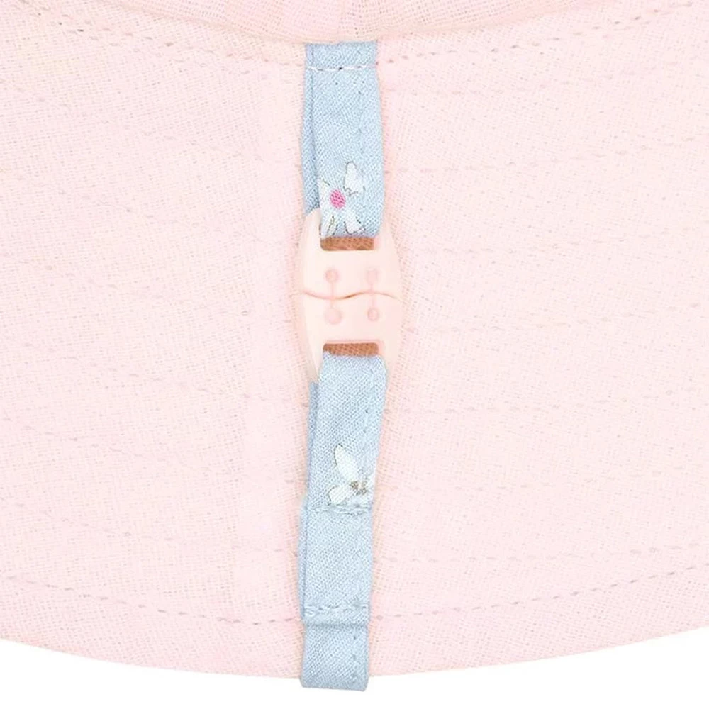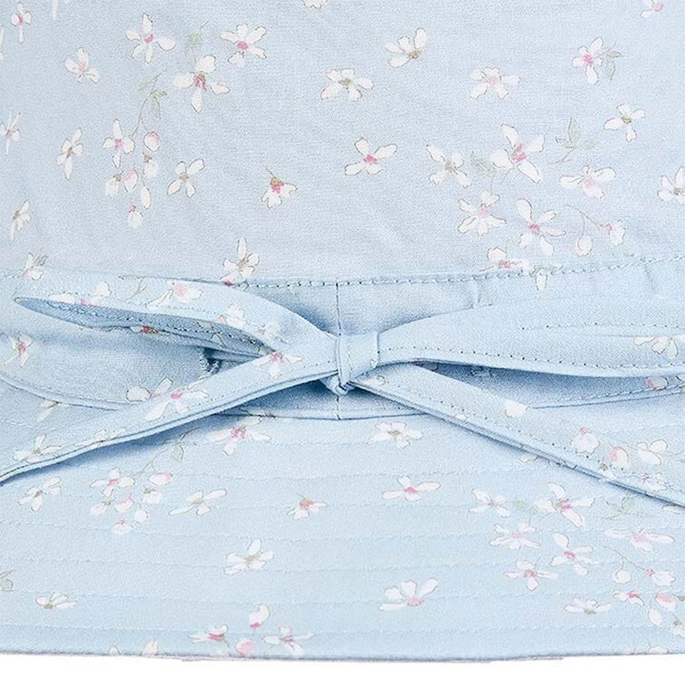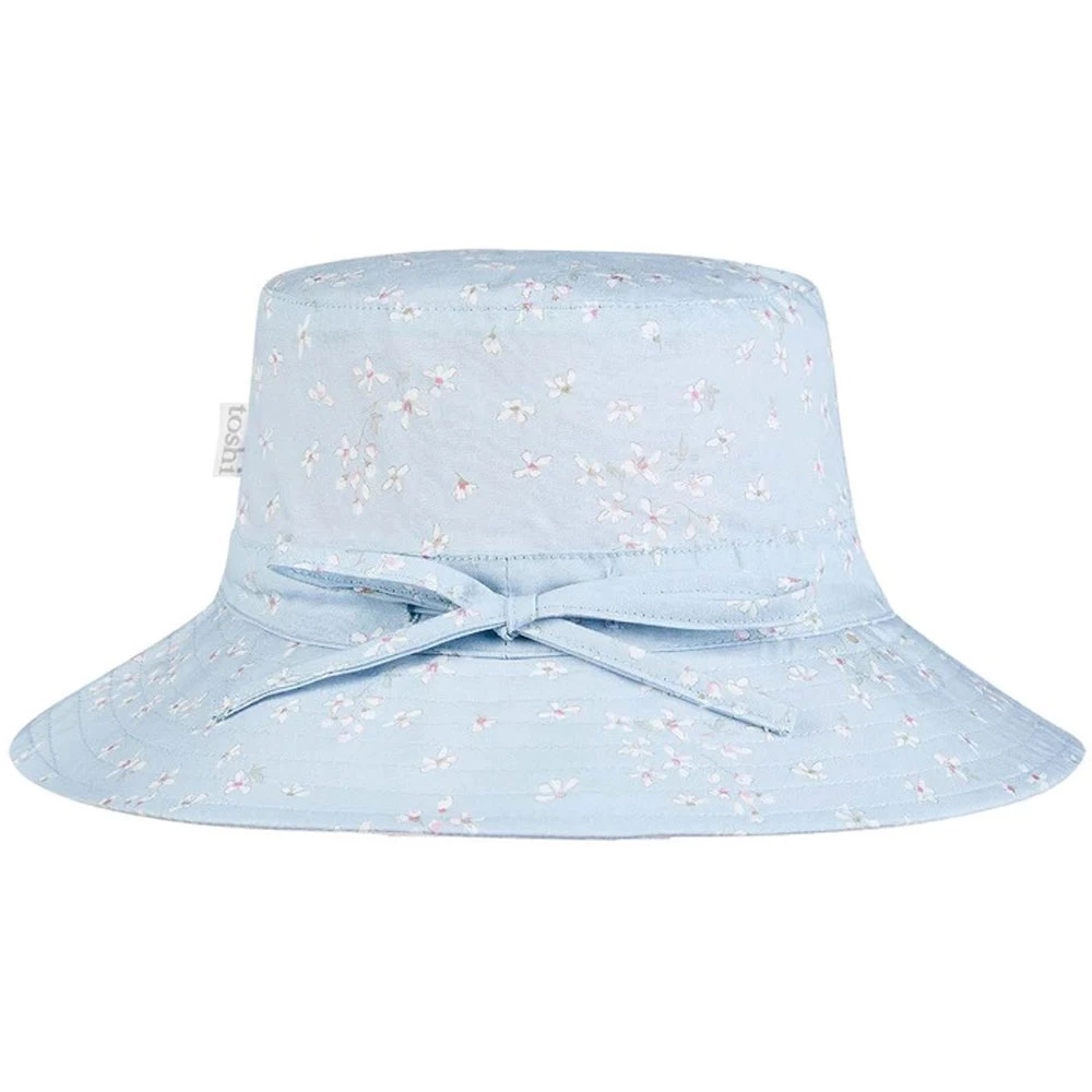 Toshi Sunhat Nina Dusk features an original and exclusive Toshi print design, an abundance of tiny delicate flowers presented in a baby blue hue with a contrasting liner in soft pink.