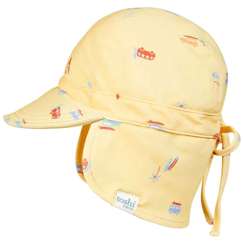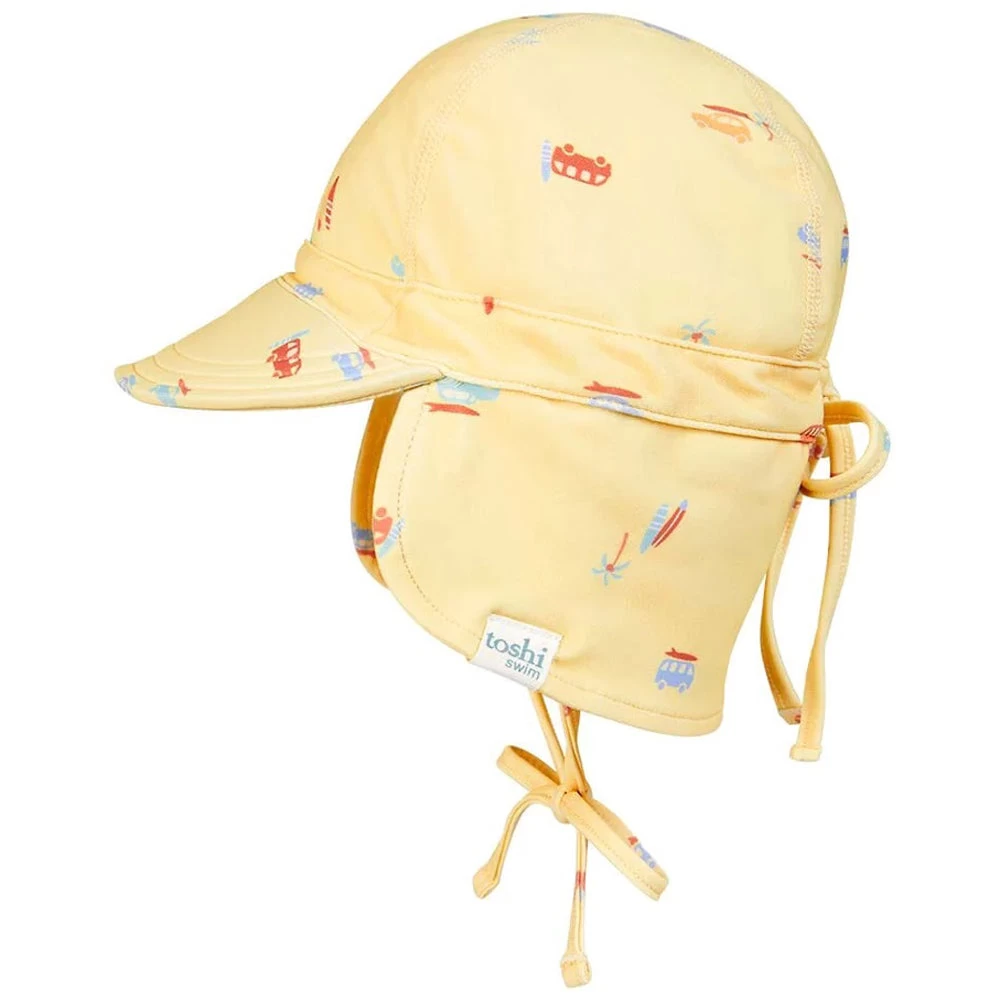 Toshi Swim Baby Flap Cap Classic Sunny features an original and exclusive Toshi print design, with surfboards and palm trees presented in a bright yellow hue.