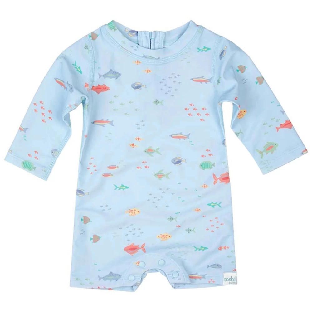 Toshi Swim Baby Onesie Long Sleeve Classic Reef features an original and exclusive Toshi print design, with colourful underwater friends presented in a baby blue hue.