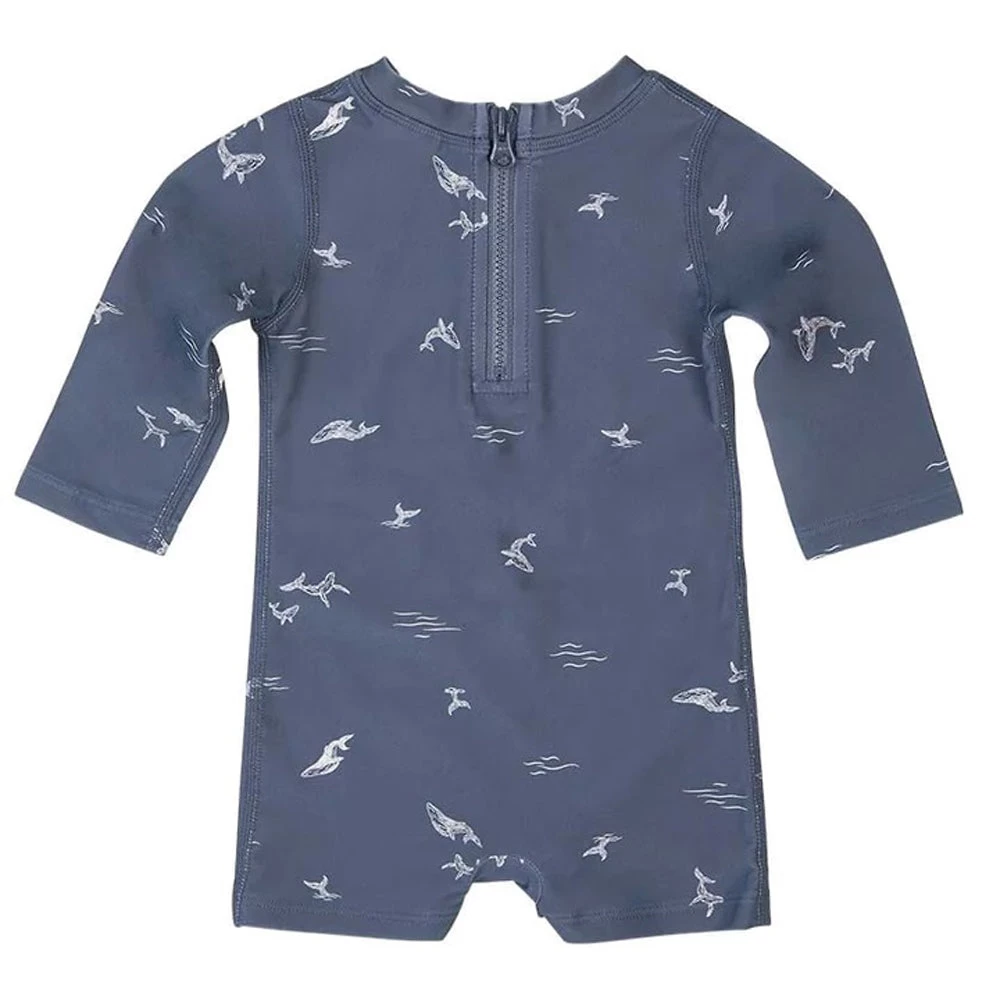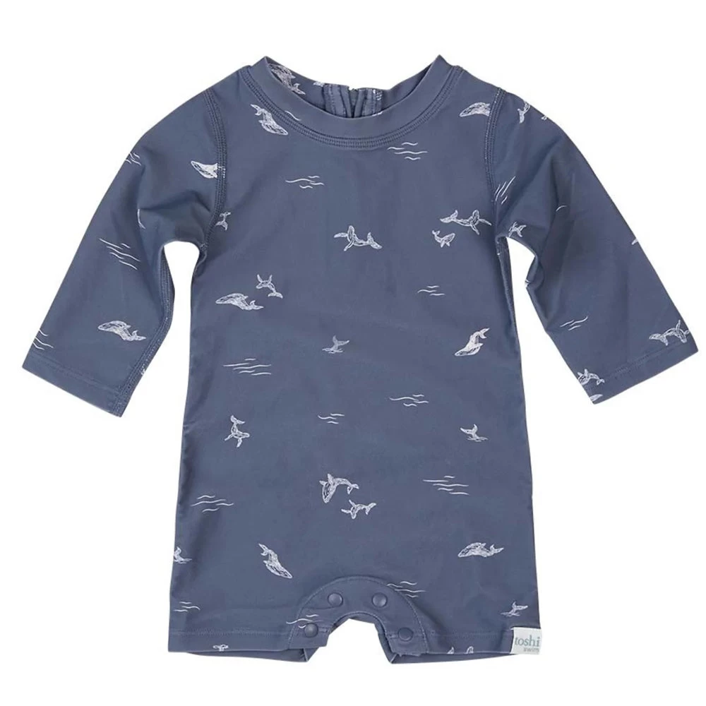 Toshi Swim Baby Onesie Long Sleeve Classic Whales features an original and exclusive Toshi print design, a school of whales presented in a classic deep navy blue hue.
