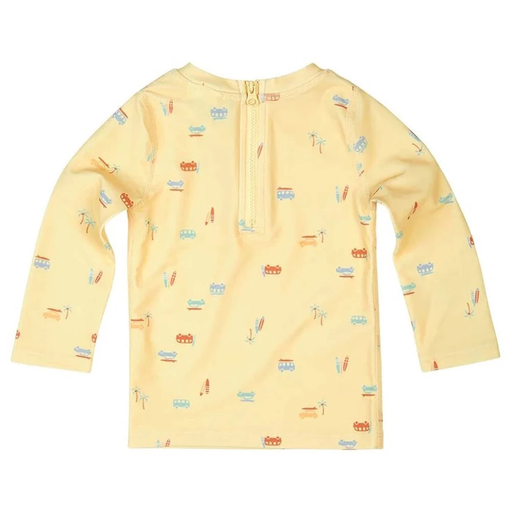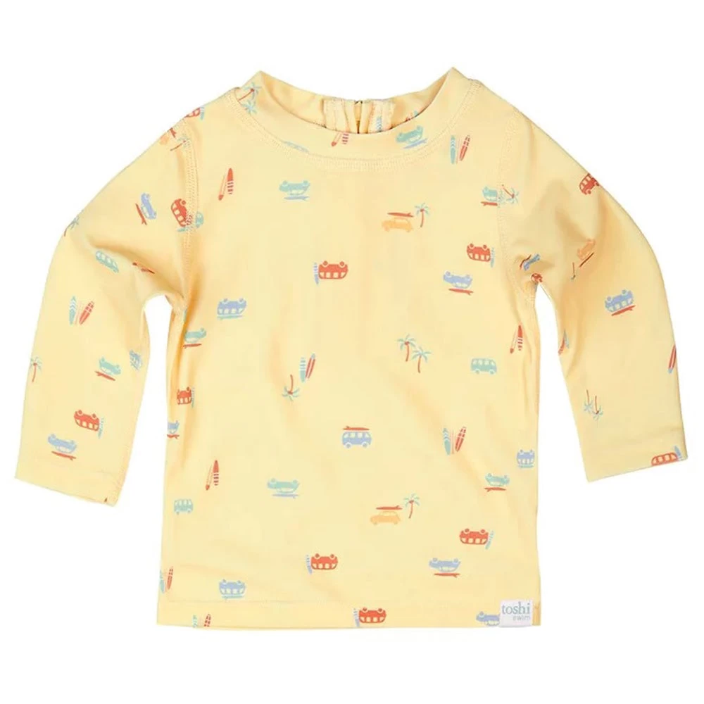 Toshi Swim Baby Rashie Long Sleeve Classic Sunny features an original and exclusive Toshi print design, with surfboards and palm trees presented in a bright yellow hue.