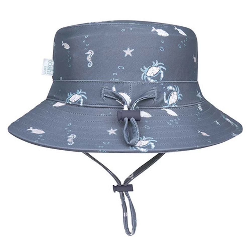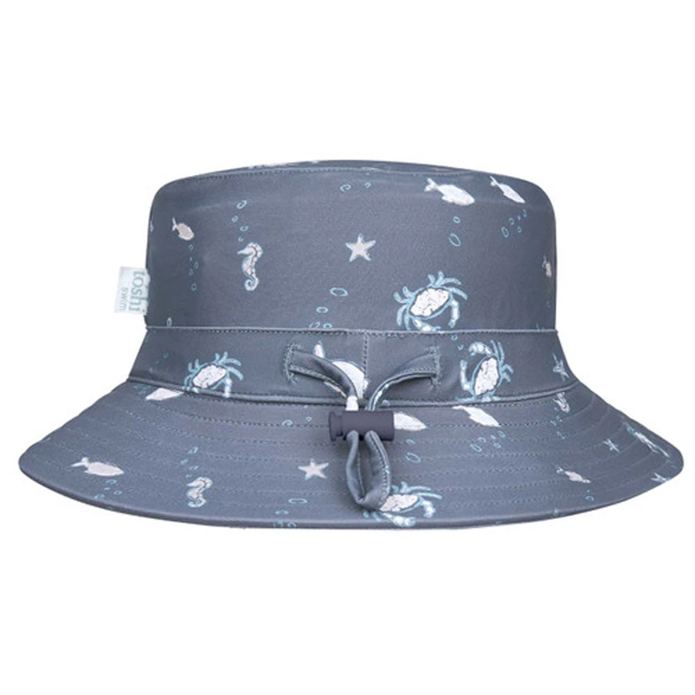 Toshi Swim Sunhat Neptune features an original and exclusive Toshi print design; a school of fish and their rock pool friends are presented in a classic deep navy blue hue.