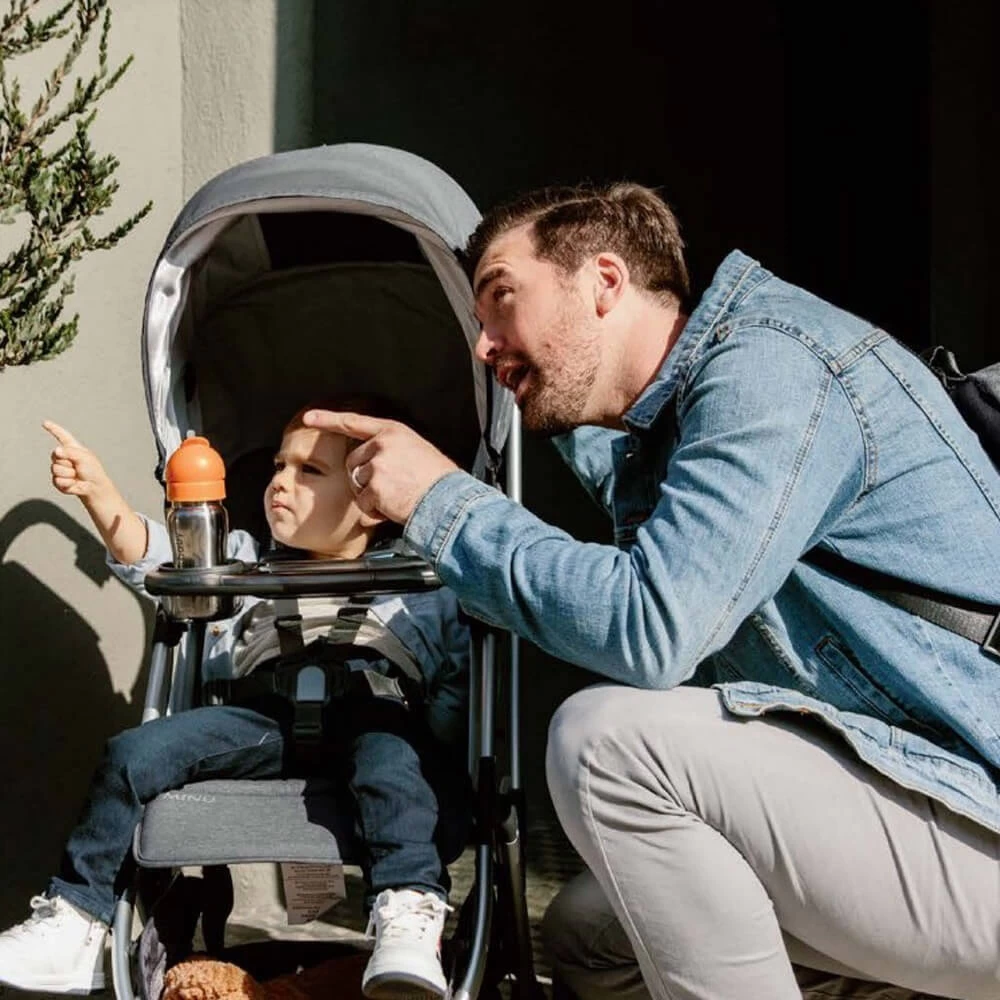 Keep your toddler satisfied while strolling with the perfect snacking surface and drink holder that attaches to the MINU pram.